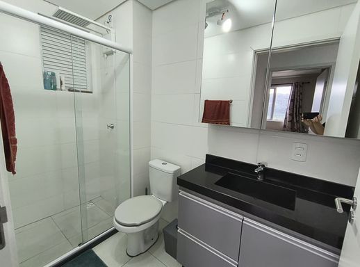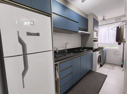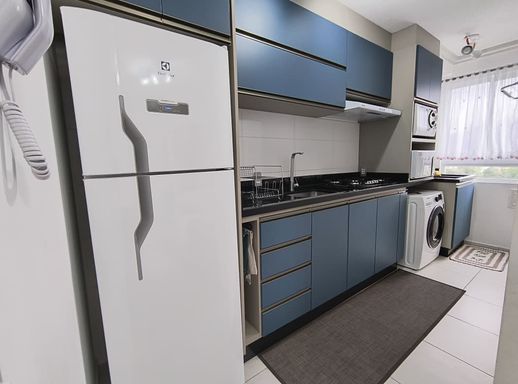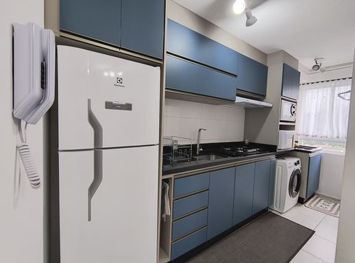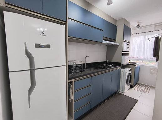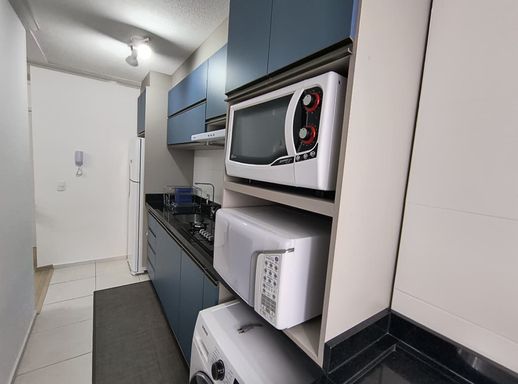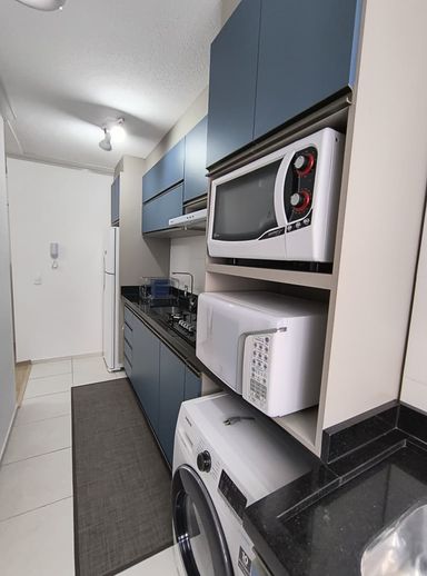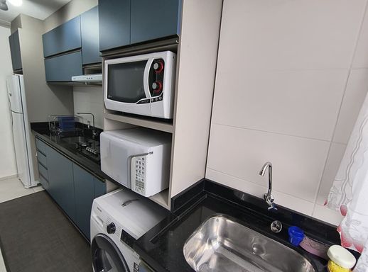 Este apartamento fica com móveis planejados e eletrodomésticos: geladeira, fogão cooktop, forno, micro-ondas e máquina de lava e seca. Saem apenas cadeiras, TV e ar-condicionado.