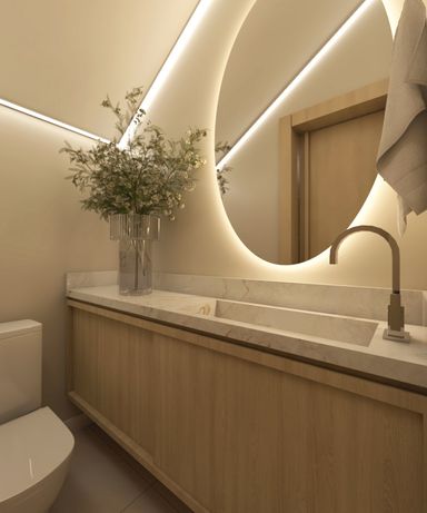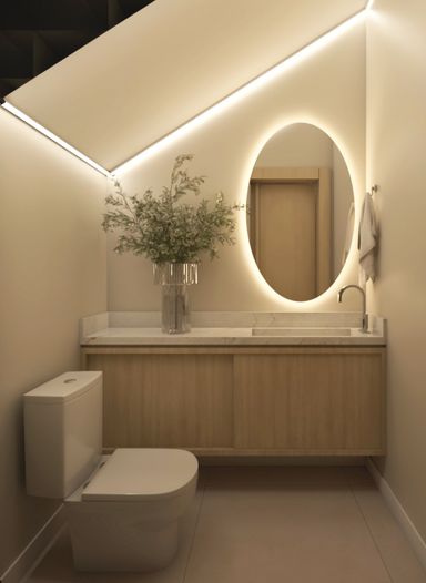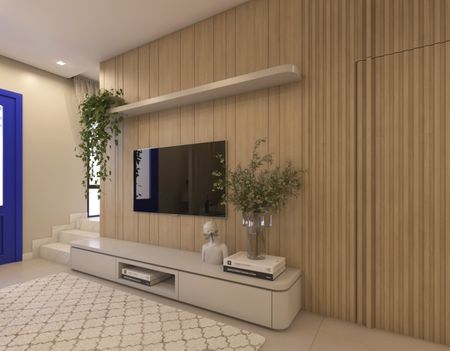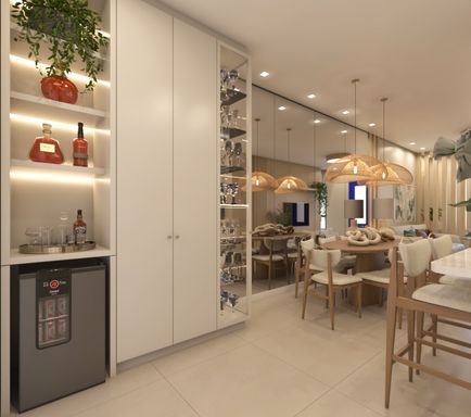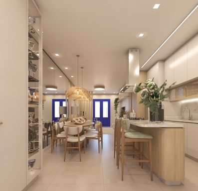 🔹 Piso inferior com integração total entre sala de TV, jantar e cozinha, lavabo, lavanderia e área externa com churrasqueira.