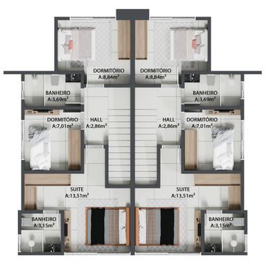 ✅ Piso superior: 1 suíte + 2 quartos + banheiro social